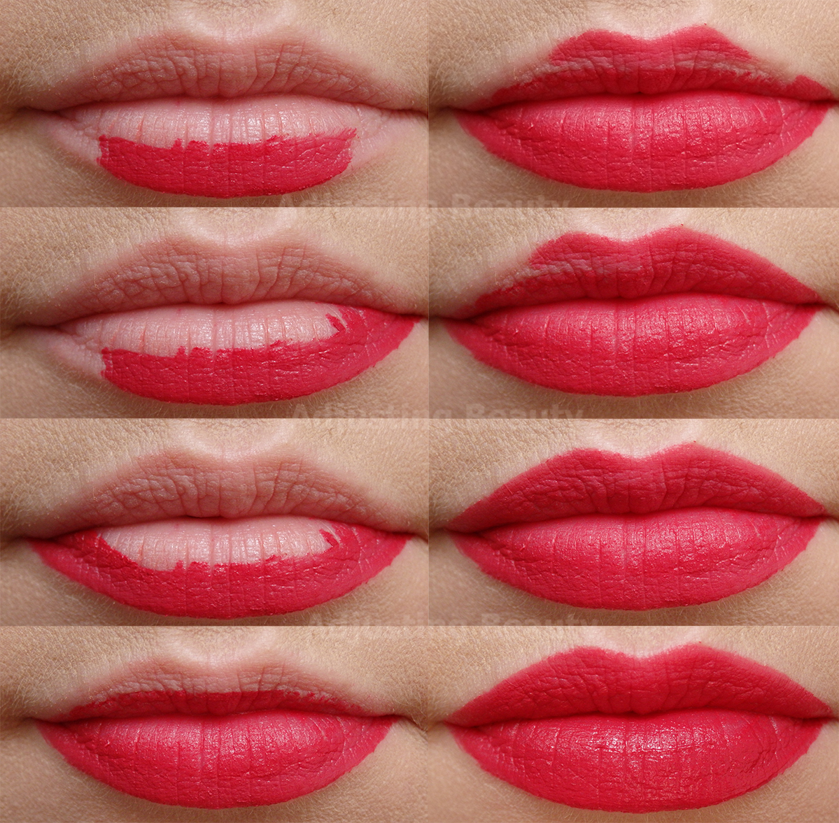 Velikokrat dobim vprašanja, kako si nanesem rdečilo za ustnice, da izgleda tako popolno. Tukaj je kratek vodiš, kako sama nanašam rdečila za ustnice. Najprej začnem s spodnjo ustnico, ker je ta že v osnovi bolj simetrična. Rdečilo nanesem na sredino ustnice, ki je tudi najnižja točka spodnje ustnice. Nato začnem zapolnjevati zunanje kotičke in sicer od zunanjega kotička ustnice proti sredini. Pomembno je, da v zunanjih kotičkih ustnic ne greš preveč ven. Drugače lahko hitro dosežeš »joker« izgled. Na koncu z enim potegom zapolnim še notranji del spodnje ustnice.